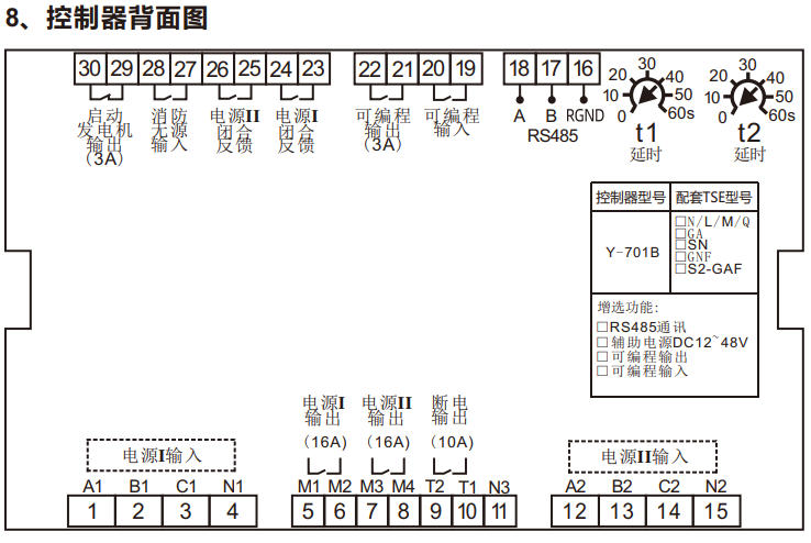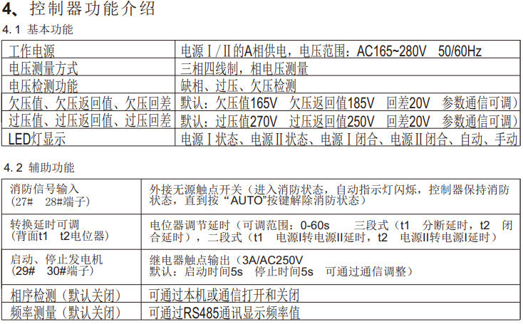 型控制器是一款分体式双电源转换开关控制器。检测电网参数的异常情况(过压 、欠压、缺相、过频、欠频、错相等),根据预定的操作模式自动控制转换开关到合适的电 源,确保负载侧供电的持续性。